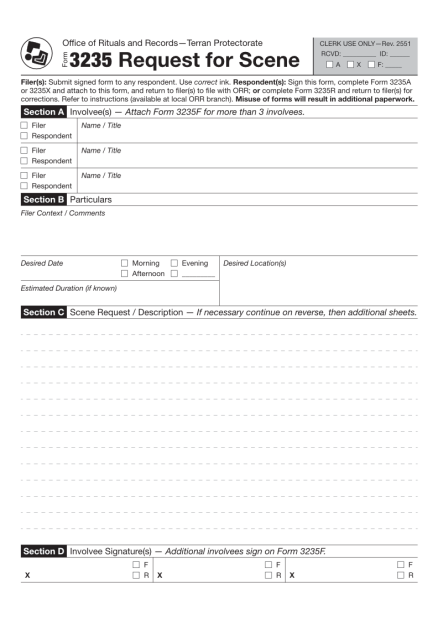 An official bureaucratic request for permission to perform a scene. References unspecified auxiliary forms 3235A and 3235X, one of which must be prepared and attached to this form. Revisions and corrections are implied to be made using form 3235R. If there are more than three involvees in the scene, form 3235F is required to list them.